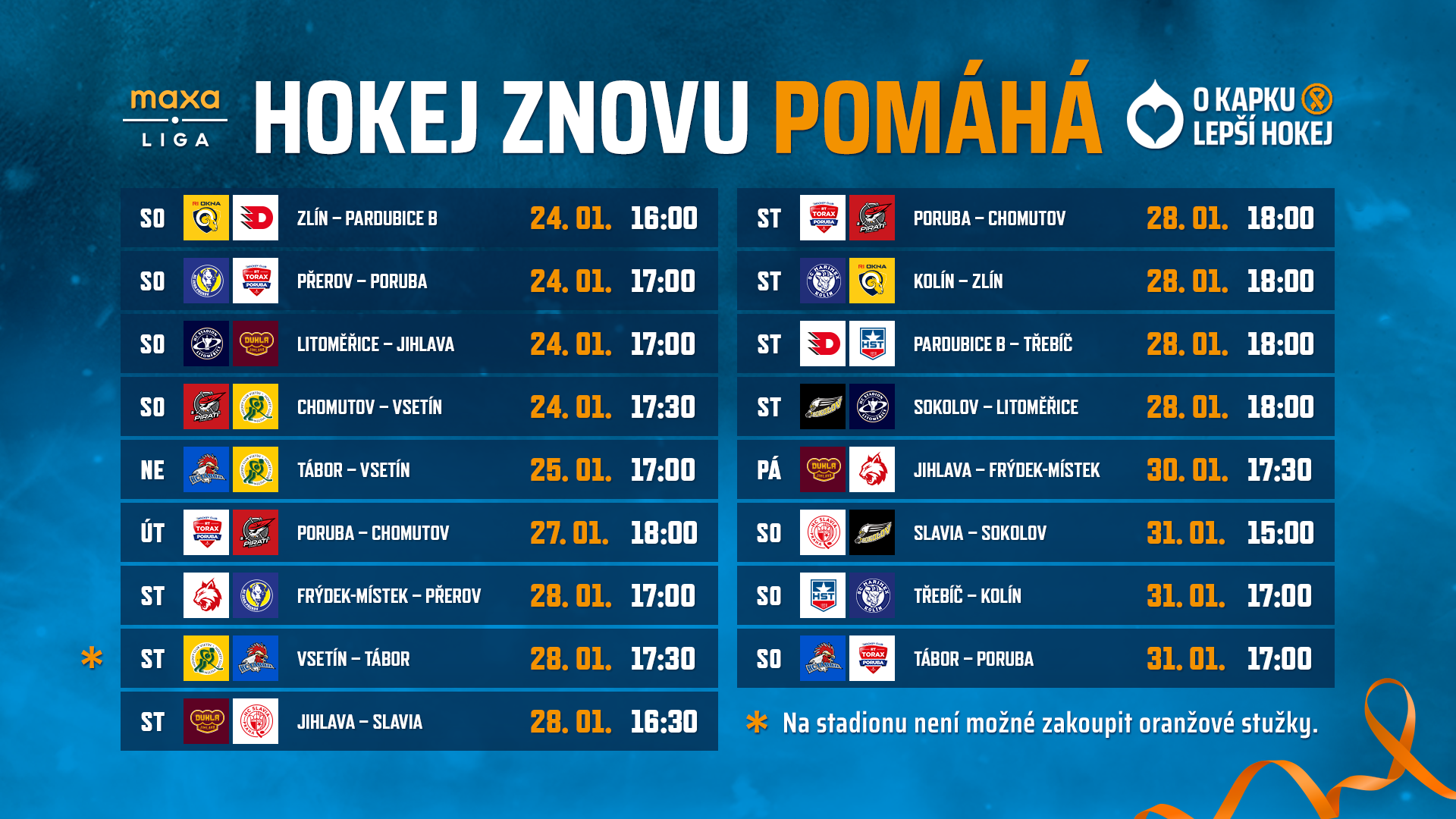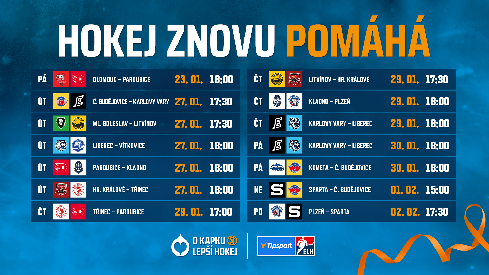 Vše o projektu a možnostech pomoci najdete na webu www.okapkulepsihokej.cz. Na stadionech se bude hrát O Kapku lepší hokej při vybraných utkáních mezi termíny 23. ledna a 4. února 2026.