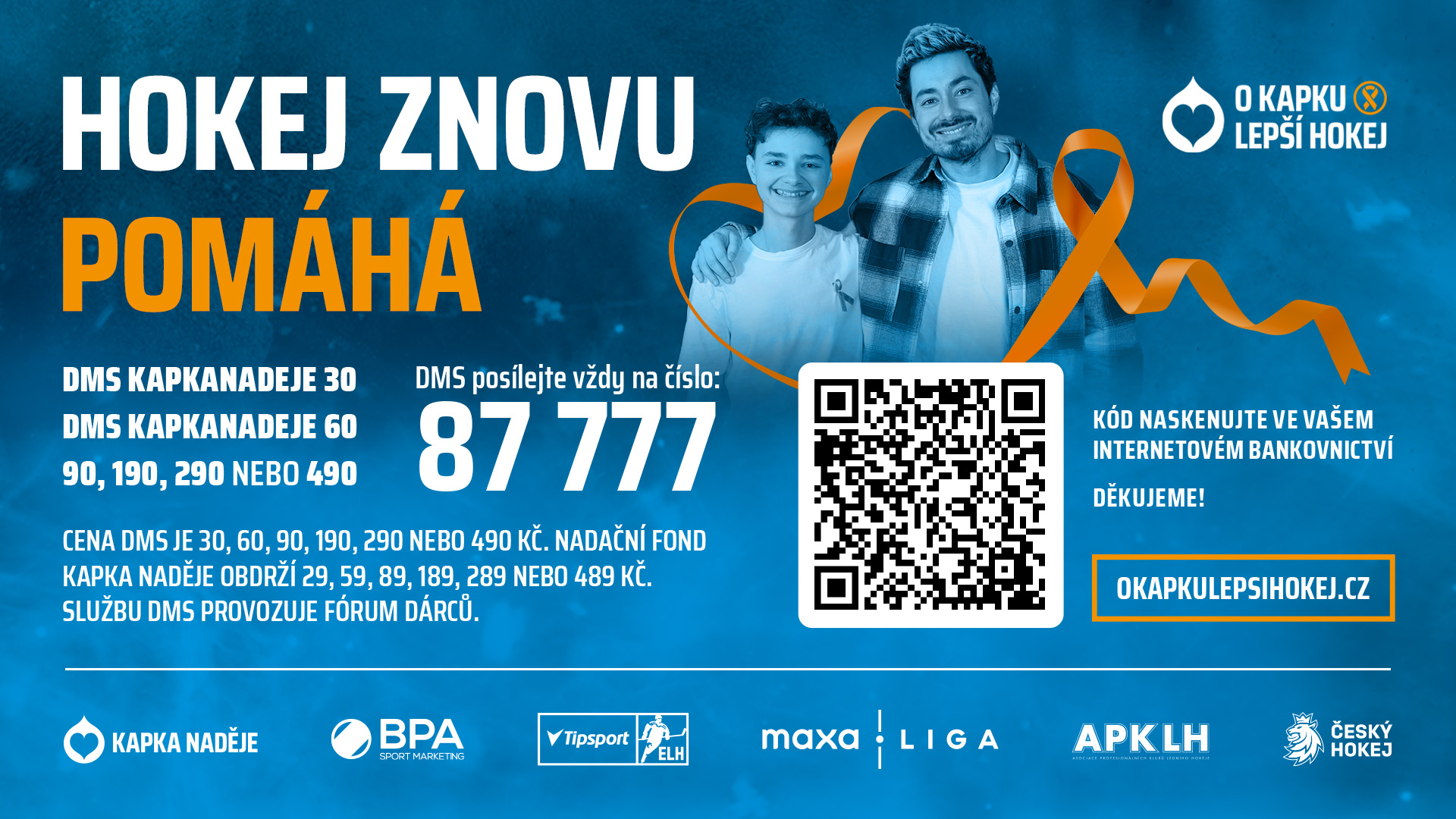 Možností je několik. Přímo na stadionech si můžete zakoupit oranžovou stužku, můžete se přihlásit do jedné z aukcí dresů nebo puků z utkání Tipsport extraligy, Maxa ligy, 2. ligy, či para hokeje. Přispět lze pomocí svého mobilního bankovnictví skrze QR kód, nebo prostřednictvím DMS. Připravovat se bude také speciální edice extraligových kartiček O Kapku lepší hokej, která bude v prodeji po odehrání všech utkání.