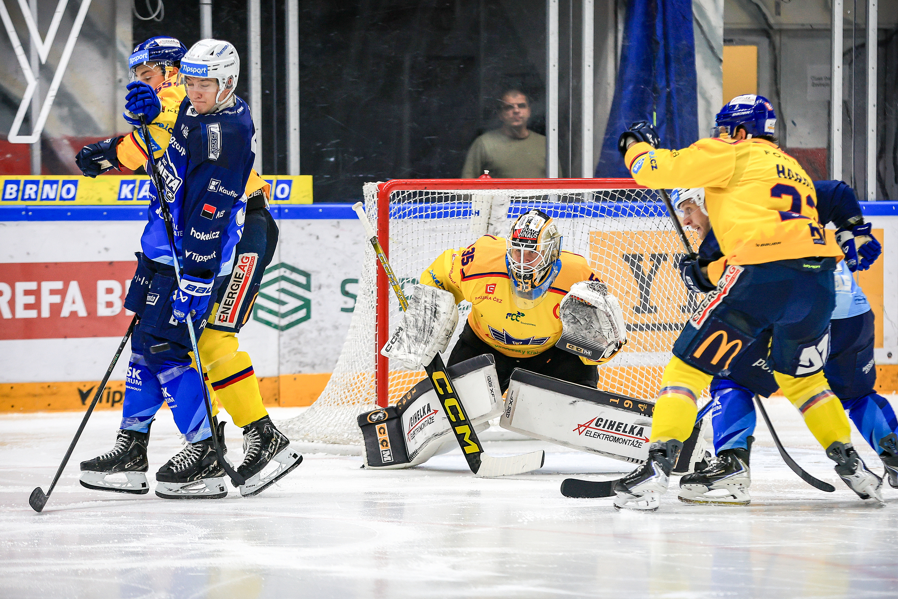 Do zápasu na brněnském ledě nastoupil Motor s uzdraveným Douderou a do branky se postavila nejnovější posila Niclas Westerholm. Brankář, který poslední soutěžní duel odchytal 26. září za Mladou Boleslav, byl od začátku v permanenci. Nejvíce Brno zahrozilo v početní výhodě. Při vyloučení Štencela měl dvě nebezpečné šance Hynek Zohorna, ale hostující obrana odolala. Po konci oslabení se tak o slovo přihlásili Jihočeši. V čase 7:40 otevřel gólový účet zápasu obránce Tomáš Cibulka, který překvapil Stezku nahozením na branku z úhlu. Brno mohlo odpovědět na konci 11. minuty elitní formací. Pospíšil podržel kotouč na holi a našel Cingela, který chtěl akci vyšperkovat a poslal přihrávku na Fleka. Brněnský kapitán zakončoval z předbrankového prostoru a Westerholm kotouč těsně vytěsnil. Hra se poté přesunula do brněnského pásma. Nejprve Stezka zmenšil Pýchovi střelecký úhel, následně po pokusu Beránka zachránila Kometu horní tyč. V 15. minutě usedl na trestnou lavici Bartejs a Motor svou první početní výhodu v utkání využil. Nick Olesen dostal dostatek času a prostoru a z pravého kruhu překonal Stezku ranou na zadní tyč. V závěru třetiny se Brno pokusilo o kontaktní branku. Zbořilův pokus vyrazil Westerholm před sebe a následný nečekaný odraz nadělal hostujícímu brankáři nemalé problémy. Naštěstí pro Jihočechy ale finský brankář stihl včas sklapnout své betony.